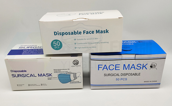 50只裝一次性口罩包裝盒常用的尺寸有:185*100*90mm,190*100*80mm,190*100*100mm;